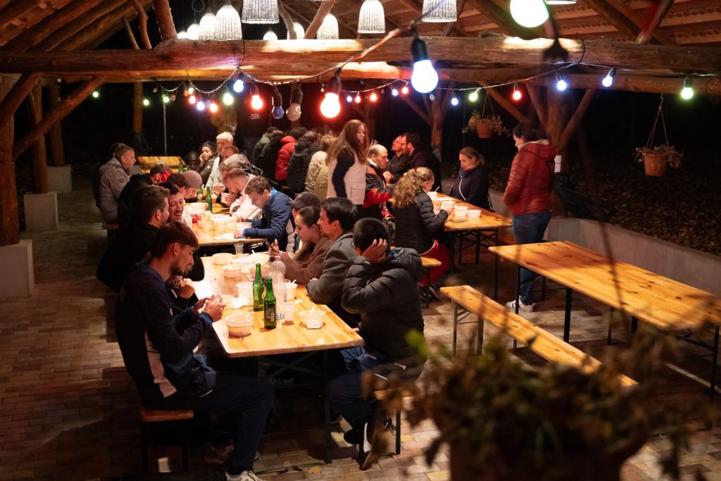 Les organisateurs avaient prévu 2 temps festifs : le dimanche soir, ils nous firent traverser la forêt pour rejoindre une salle des fêtes en pleine nature à Tapiobicske. Nous étions hébergés à Tapioszentmarton et les matchs avaient lieu à Nagykata, il était donc important pour l’équipe d’organisation que nous passions au moins une soirée dans la ville du club organisateur. Malgré la température bien fraîche pour un repas en terrasse, les joueurs se mélangèrent un peu et se réchauffèrent autour d’un bon paprikas krumpli (ragoût de pommes de terre au paprika) préparé dans un chaudron par les bénévoles locaux.